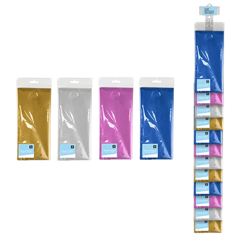 Each pack comes with six individual sheets of tissue paper, measuring 50 x 70cm. Available in four assorted colours